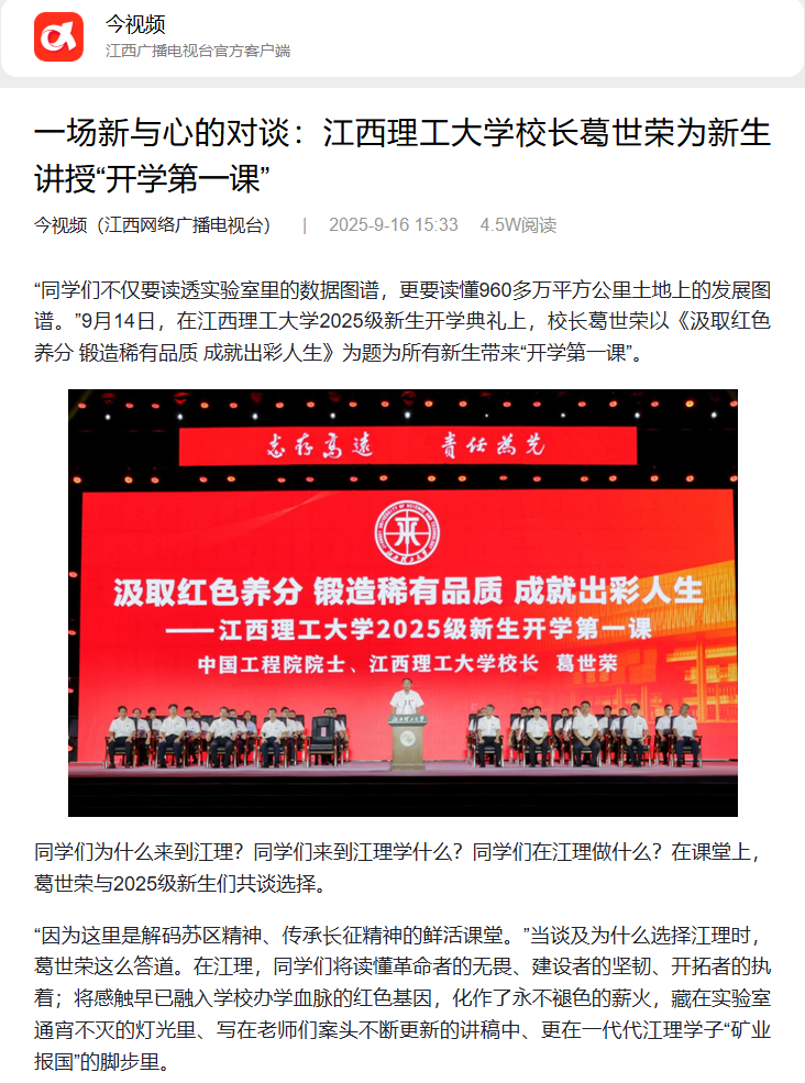 葛世荣称,时代呼唤青年学子以创新思维突破技术壁垒,用前沿探索引领产业升级,同学们在江理要勇于创新、敢于创业、善于创意。葛世荣希望同学们在国情认知上做“勘探者”,在实践历练中当“淬火钢”,在服务基层和人民中成“高强钢”,像稀土永磁体那样牢牢吸附在服务基层、造福人民的火热实践中,在德智体美劳的锻造中,成长为有温度、有韧性、有光芒的江理人。