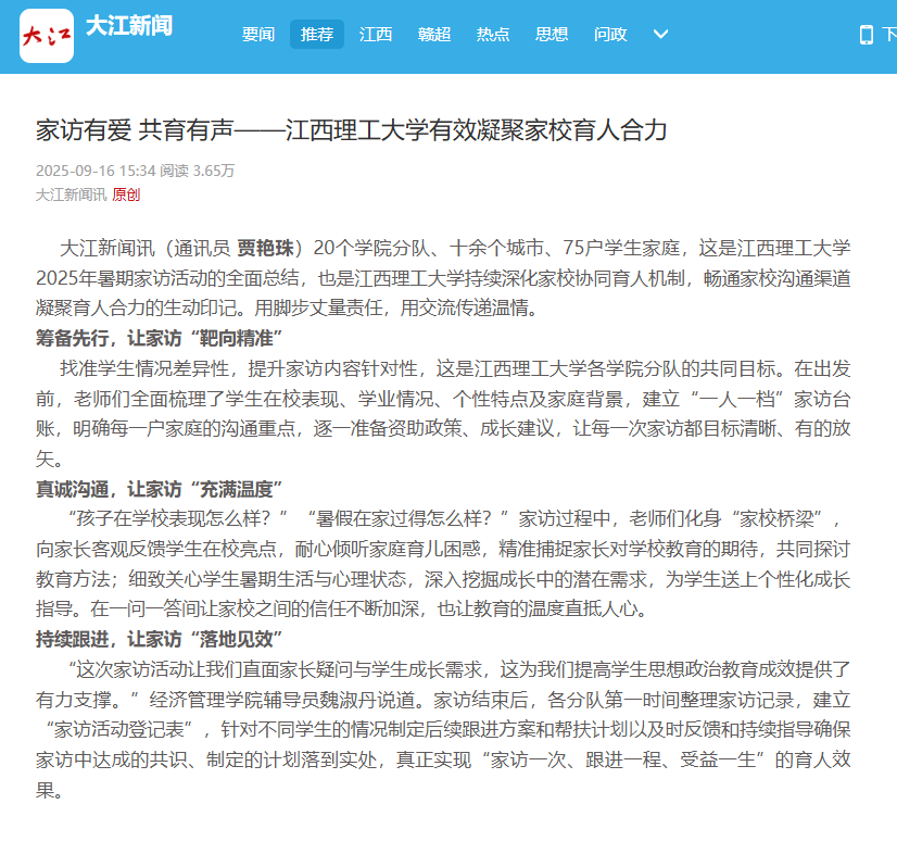 “这次家访活动让我们直面家长疑问与学生成长需求,这为我们提高学生思想政治教育成效提供了有力支撑。”经济管理学院辅导员魏淑丹说道。家访结束后,各分队第一时间整理家访记录,建立“家访活动登记表”,针对不同学生的情况制定后续跟进方案和帮扶计划以及时反馈和持续指导确保家访中达成的共识、制定的计划落到实处,真正实现“家访一次、跟进一程、受益一生”的育人效果。