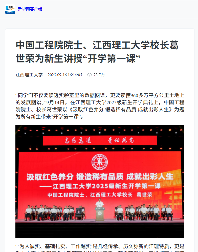 “同学们不仅要读透实验室里的数据图谱,更要读懂960多万平方公里土地上的发展图谱。”9月14日,在裸聊直播 2025级新生开学典礼上,中国工程院院士、校长葛世荣以《汲取红色养分 锻造稀有品质 成就出彩人生》为题为所有新生带来“开学第一课”。