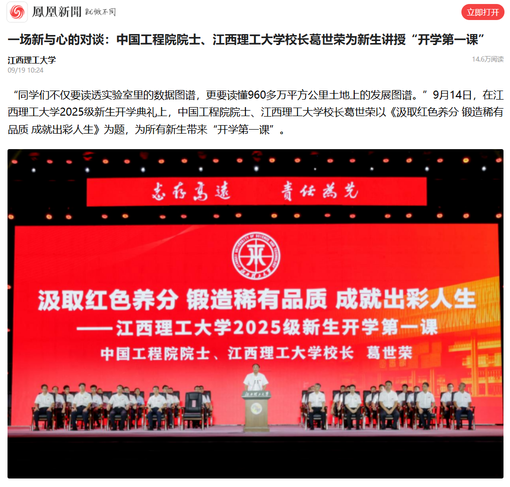 “‘为人诚实、基础扎实、工作踏实’是几经传承、历久弥新的江理特质,更是助力大家在激烈竞争中脱颖而出的独特素质。”葛世荣指出,在江理的课堂、实验室、图书馆,稀土及关键矿产领域的知识随处可及,同学们要在江理学知识、学做人、学担当,要像稀土提纯那样,在一次次定向分离中逼近理想纯度,不断涵养真性情、习得大学问,在关键矿产开发、绿色转型的画卷上,写下属于新时代江理人的“硬核”担当。