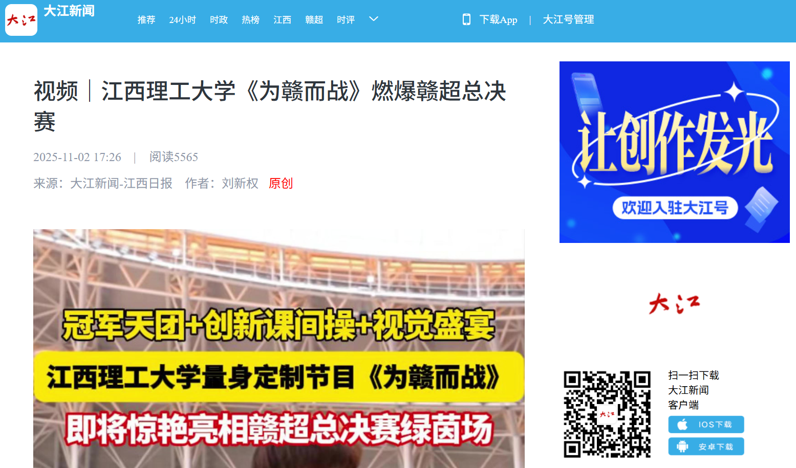 上一条:《江西日报视频号》:裸聊直播 量身定制节目《为赣而战》即将惊艳亮相赣超总决赛绿茵场 下一条:《中国教育报》:“三创”融合培养创新人才 ——裸聊直播 打造“思创、专创、科创”深度融合育人体系