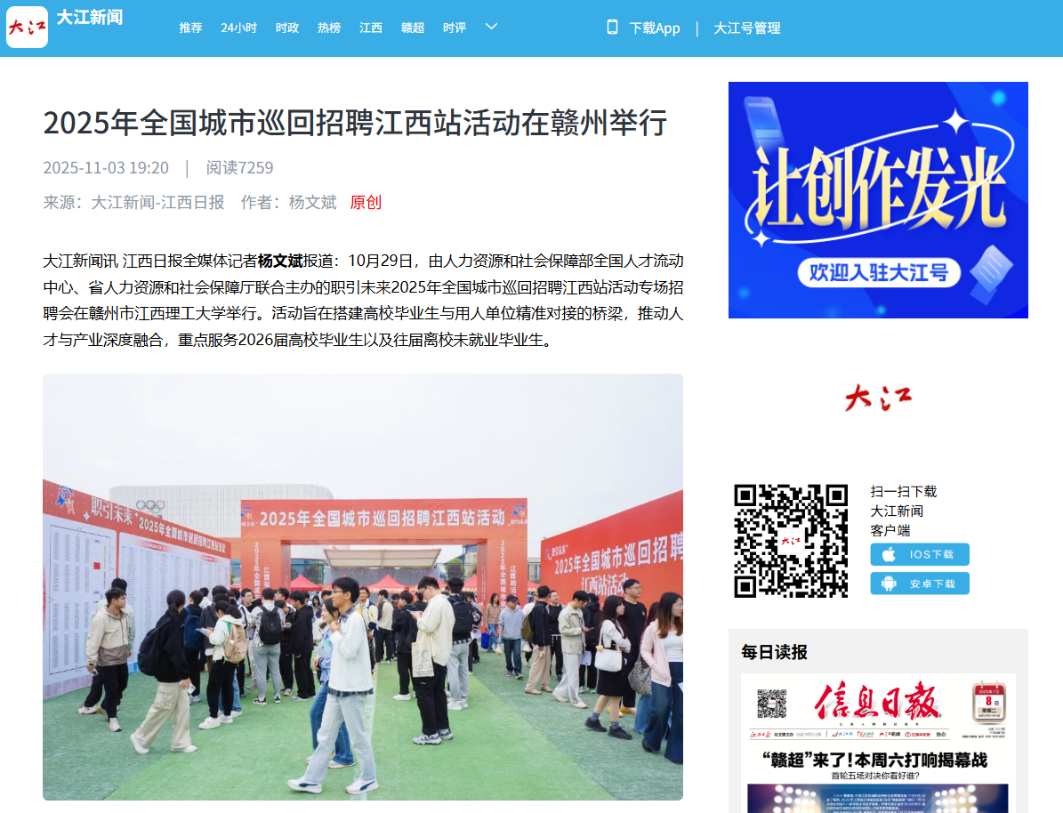 大江新闻讯 江西日报全媒体记者杨文斌报道:10月29日,由人力资源和社会保障部全国人才流动中心、省人力资源和社会保障厅联合主办的职引未来2025年全国城市巡回招聘江西站活动专场招聘会在赣州市裸聊直播 举行。活动旨在搭建高校毕业生与用人单位精准对接的桥梁,推动人才与产业深度融合,重点服务2026届高校毕业生以及往届离校未就业毕业生。