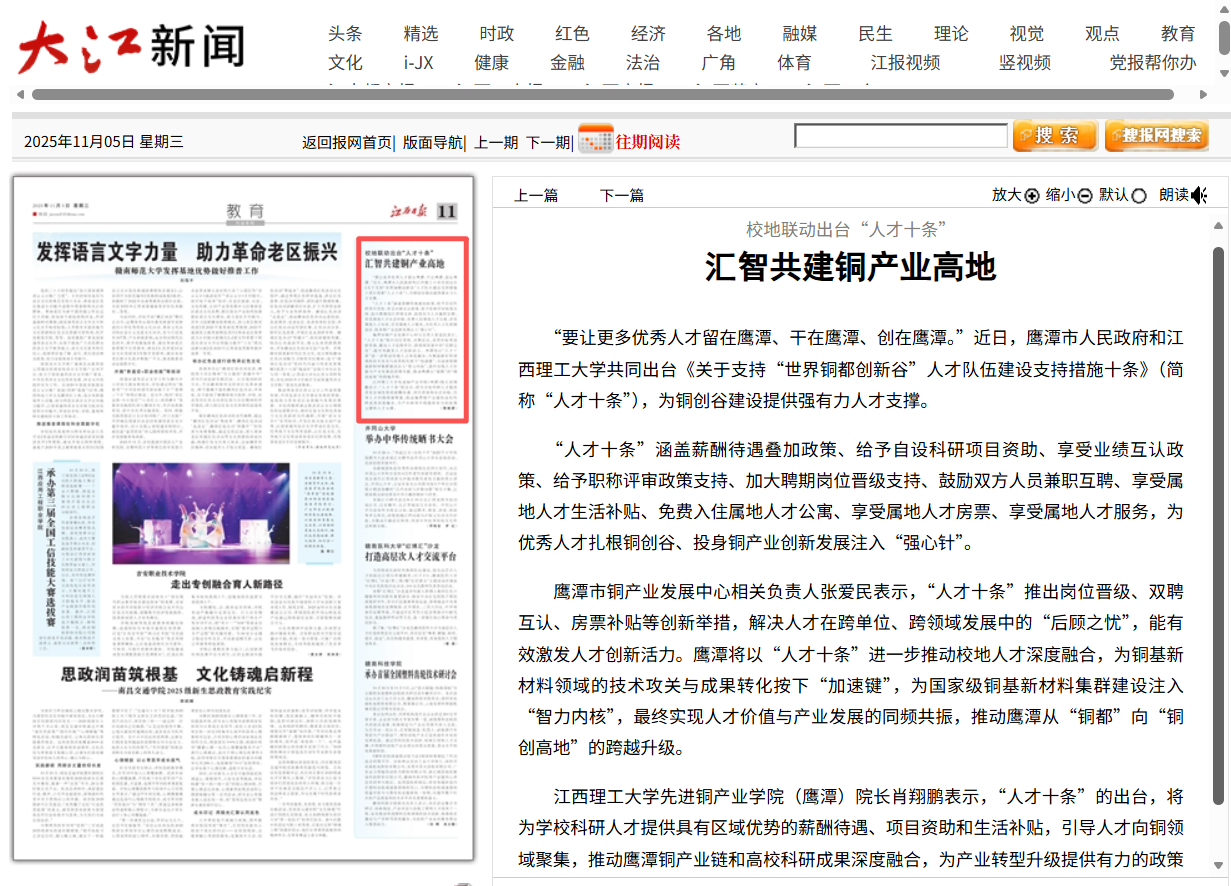 鹰潭市铜产业发展中心相关负责人张爱民表示,“人才十条”推出岗位晋级、双聘互认、房票补贴等创新举措,解决人才在跨单位、跨领域发展中的“后顾之忧”,能有效激发人才创新活力。鹰潭将以“人才十条”进一步推动校地人才深度融合,为铜基新材料领域的技术攻关与成果转化按下“加速键”,为国家级铜基新材料集群建设注入“智力内核”,最终实现人才价值与产业发展的同频共振,推动鹰潭从“铜都”向“铜创高地”的跨越升级。