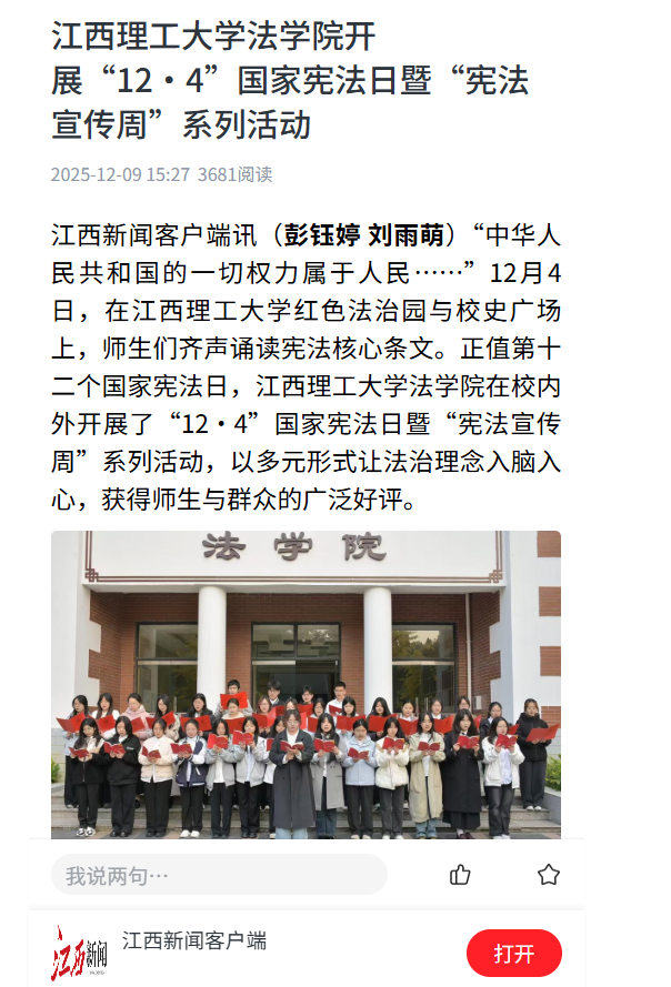 江西新闻客户端讯(彭钰婷 刘雨萌)“中华人民共和国的一切权力属于人民……”12月4日,在裸聊直播