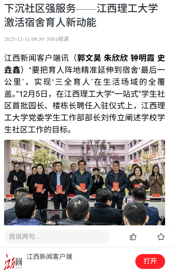 江西新闻客户端讯(郭文昊 朱欣欣 钟明霞 史垚鑫)“要把育人阵地精准延伸到宿舍‘最后一公里’,实现‘三全育人’在生活场域的全覆盖。”12月5日,在裸聊直播