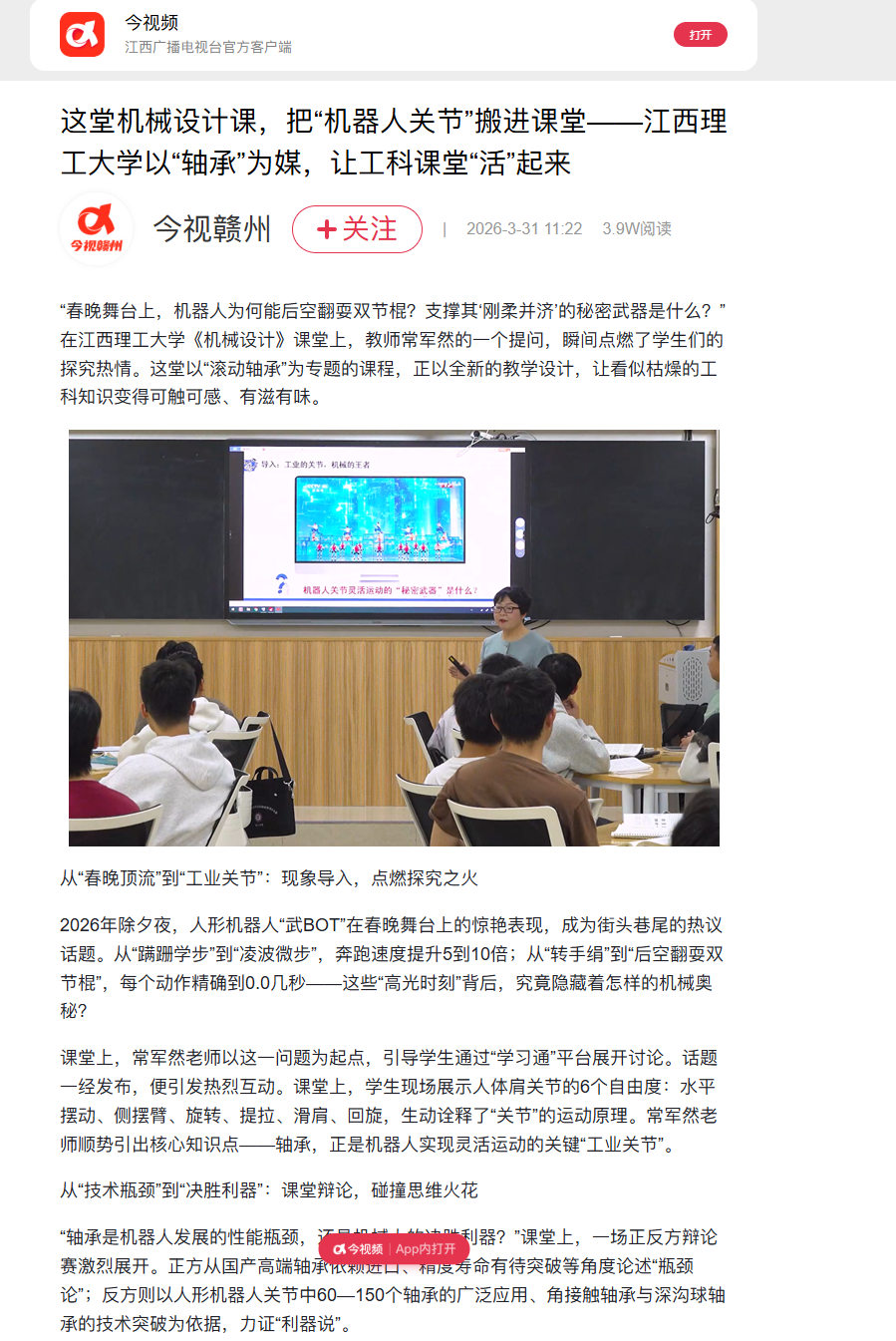 《机械设计》课堂上,教师常军然的一个提问,瞬间点燃了学生们的探究热情。这堂以“滚动轴承”为专题的课程,正以全新的教学设计,让看似枯燥的工科知识变得可触可感、有滋有味。