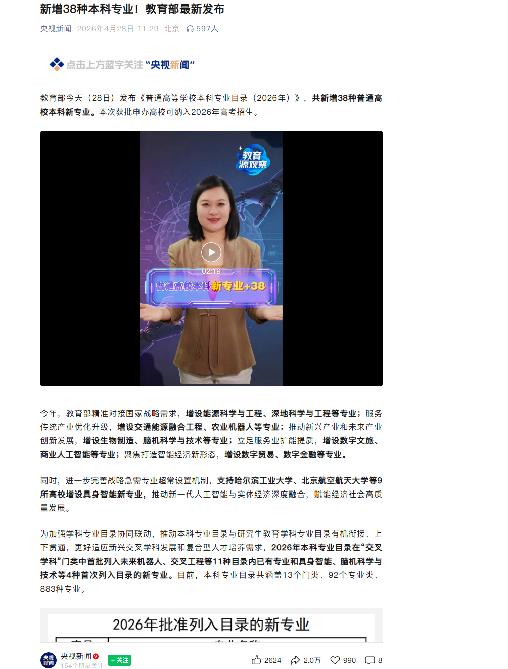 《央视新闻》:新增38种本科专业!教育部最新发布