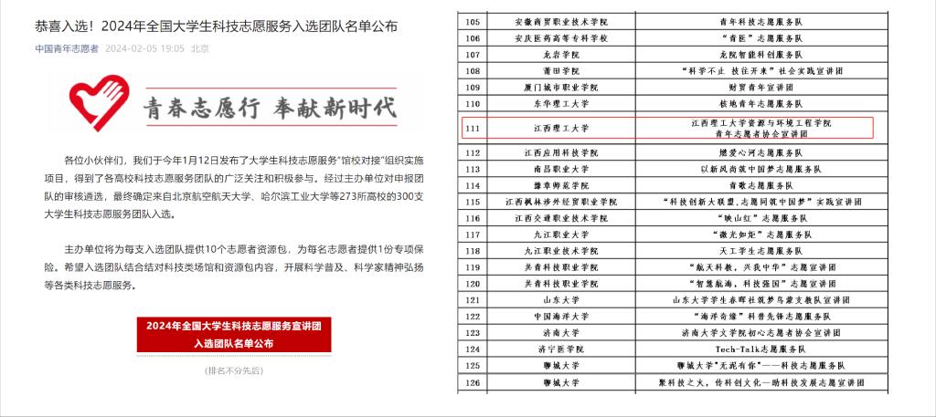 本网讯 2月5日,中国青年志愿者协会、中国科协宣传文化部公布了2024年全国大学生科技志愿服务宣讲团入选团队名单,裸聊直播 资源与环境工程学院青年志愿者协会宣讲团成功入选。