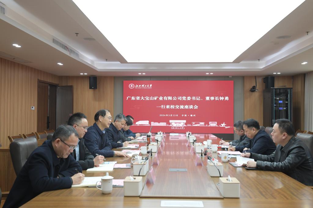 本网讯 3月13日上午,广东省大宝山矿业有限公司党委书记、董事长钟勇一行来访。校党委常委、副校长廖春发,校党委常委、副校长董冰岩在三江校区濂溪楼1号会议室会见来宾并召开交流座谈会。校党委研究生工作部、科学技术处、国内合作促进中心、资源与环境工程学院等相关负责人参加会议。座谈会由董冰岩主持。