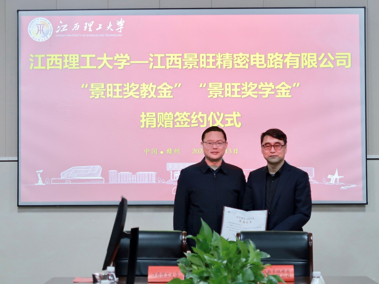 “景旺奖教金”“景旺奖学金”捐赠签约仪式在三江校区九章楼303会议室举行。江西景旺精密电路有限公司信丰公司总经理张建庭,校党委常委、副校长熊志华出席会议。党委学生工作部等相关职能部门代表,理学院、信息工程学院代表及专业教师等参加捐赠签约仪式。