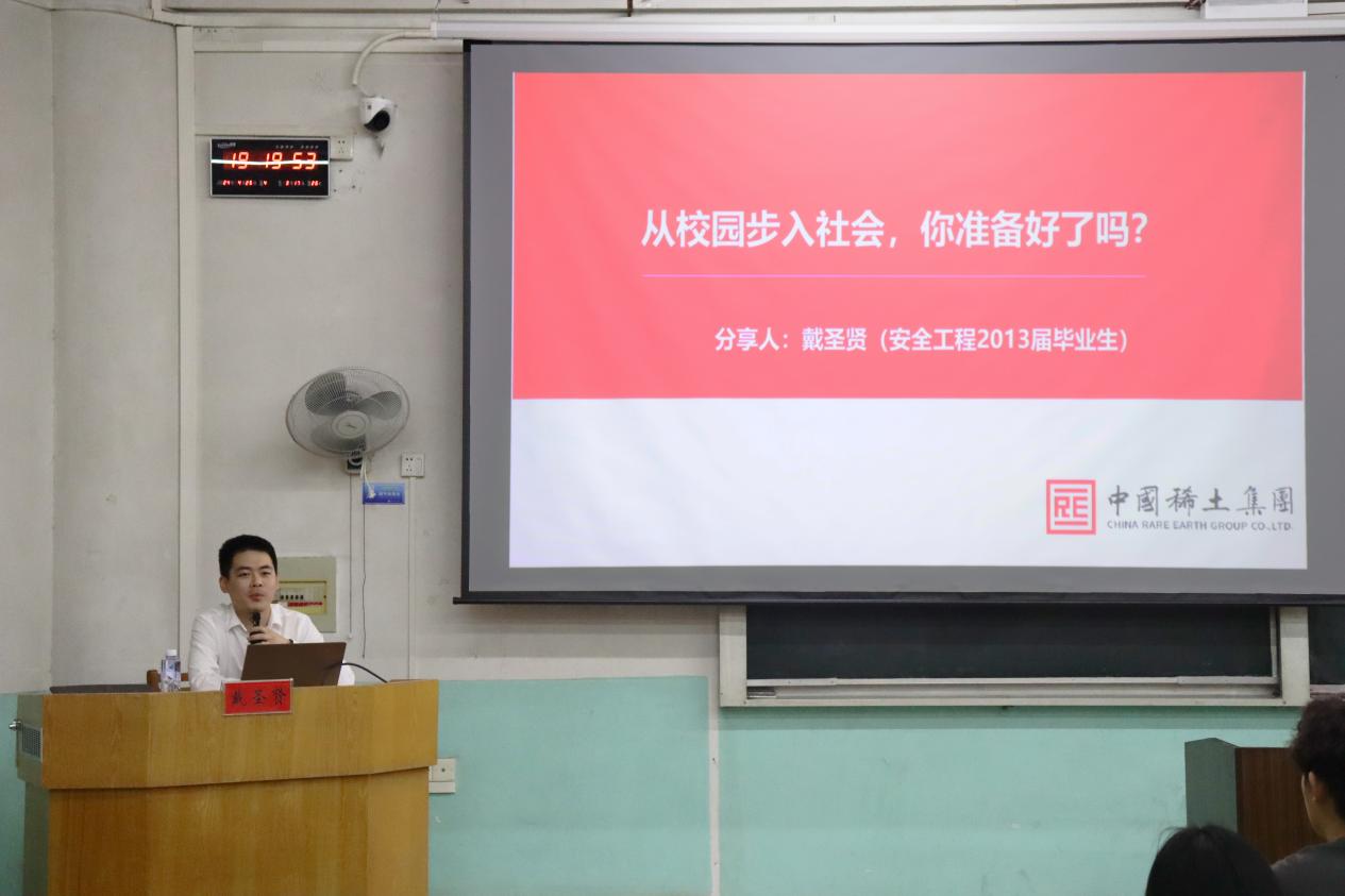 本网讯  4月25日,应急管理与安全工程学院在红旗校区主教学楼D02教室举办“红蓝绿”讲坛——与校友面对面,邀请中国稀土集团南方稀土国际贸易有限公司副总经理、安全工程专业2013届毕业生戴圣贤作题为《从校园步入社会,你准备好了吗?》的讲座。讲座由学院党委副书记李肖锋主持。应急管理与安全工程学院学生参加讲座。
