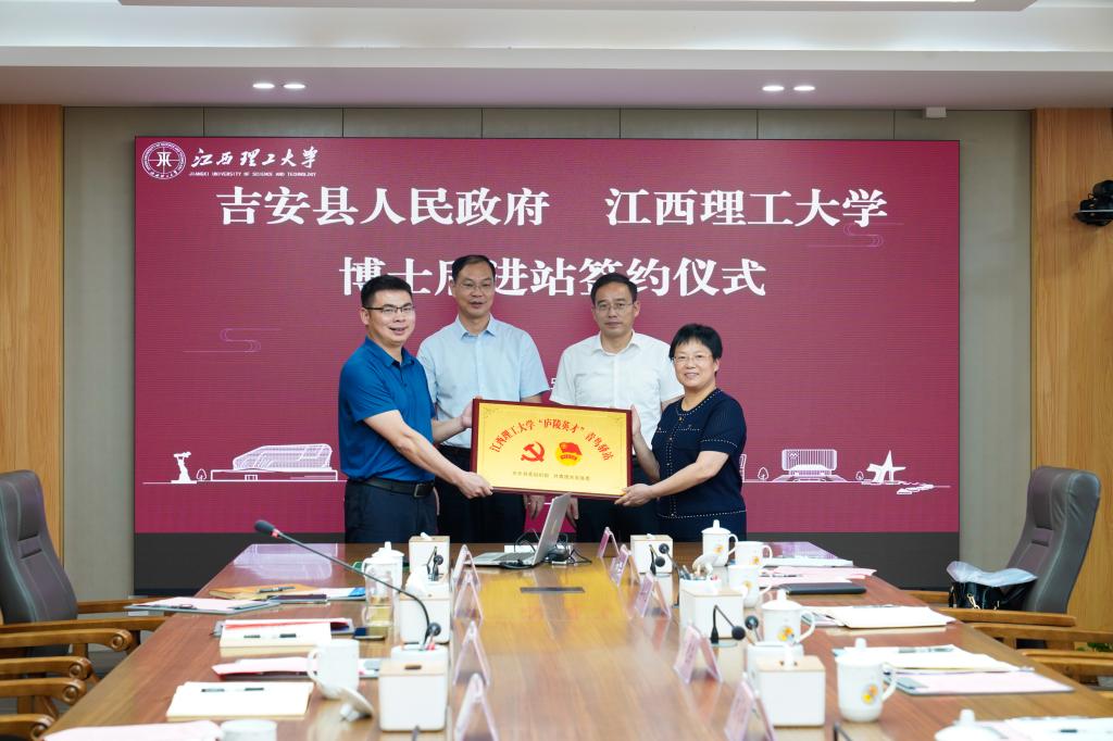 随后,现场举行博士后进站签约仪式。地方企业代表刘莺分别与校人事处副处长李冰、冶金工程学院教师赖卫进行签约。吉安县政协副主席刘筱红为学校引才联络站授牌。吉安县领导为学校八位校园引才大使颁发聘书并合影留念。