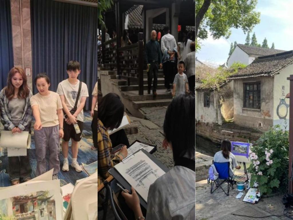 在十天的课程中,同学们风雨无阻,在老师的带领下走进甪直,用画笔记录下这里的美景和风情。作品分为传统建筑风景类、现代设计创意类和师生合作的创新实践类作品。同学们通过在甪直水乡的写生课程,更深刻地体验了乡村自然风光、人文景观以及当地的文化特色,锻炼了学生们的绘画技巧,更提升了对生活的观察力,激发了创作灵感。