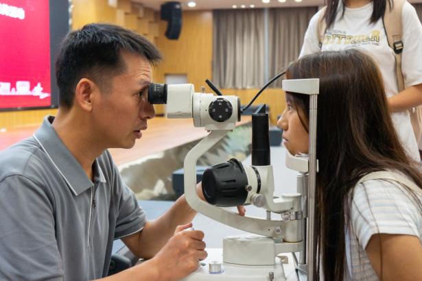 最后,吴克雄运用视力表、眼底检查仪、眼压计、裂隙灯等开展了义诊活动。在场师生们纷纷踊跃参与,为自己的眼睛做了一次科学检查。