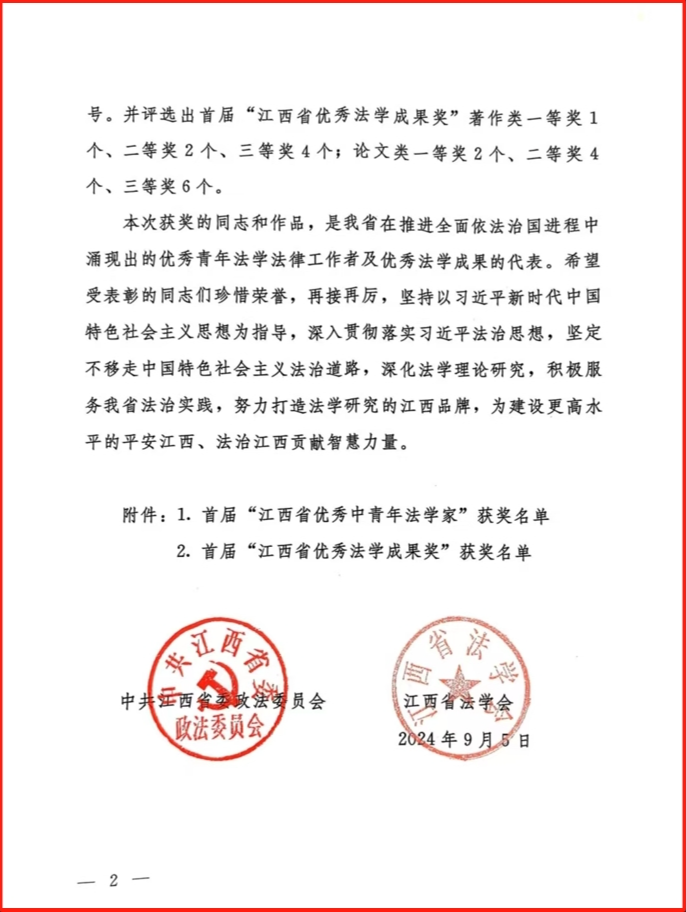 据悉,江西省优秀中青年法学家和优秀成果奖是经省委、省政府批准,省委政法委、省法学会组织开展的评选活动,旨在深入学习贯彻党的二十大精神,深入贯彻落实习近平法治思想,全面促进法学人才培养,全力推动江西省法学事业繁荣发展。首届“江西省优秀中青年法学家和优秀法学成果奖”评选表彰活动历时9个月,评选出“江西省中青年法学家”10名,“江西省优秀法学成果奖”19项,其中著作类7项,论文类12项。