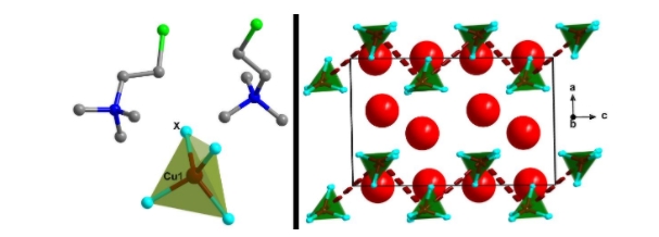 图1 (a)配合物1 (X = Cl)和2 (X = Br)在293 K下的分子结构,(b)晶体堆积图1和2(沿b轴向下看)。[(CH3)3N(CH2)2Cl]+ 离子用红色球形表示。