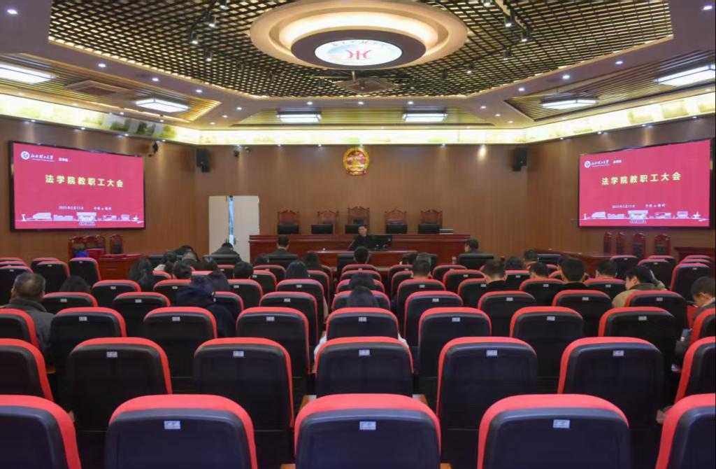 本网讯 2月15日上午,法学院在智慧模拟法庭召开新学期教职工大会。校党委常委、副校长黄志繁出席并讲话,法学院领导班子、全体教职工参加会议。会议由法学院院长项波主持。