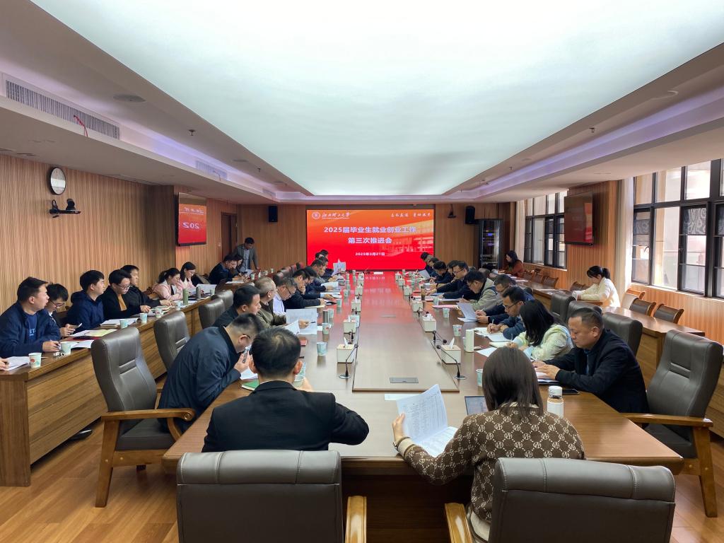 2025届毕业生就业创业工作第三次推进会在三江校区濂溪楼2号会议室召开。校党委常委、副校长熊志华出席,招生就业处、研究生院、各学院就业工作分管领导、就业辅导员等参加会议。