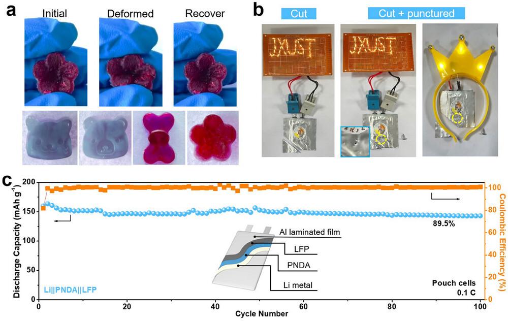 图2 a) 通过模压制造的三维任意形状PNDA的照片;b) Li||PNDA||NMC软包电池的照片,该电池在被折叠和穿刺后仍能为LED灯供电;c) Li||PNDA||LFP软包电池在25°C下,在2.5-4.0 V电压范围内的循环性能;电池容量为0.11 Ah(锂负极厚度:50 µm)。