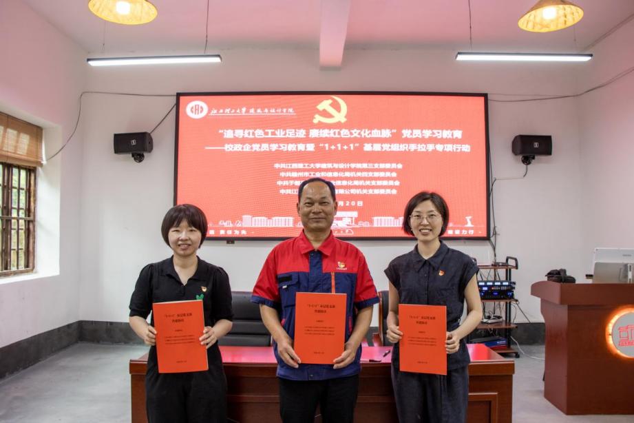建筑与设计学院院长王犹建应邀为全体同志作了《中央苏区时期红色工业遗产》的专题讲座,学院党委副书记刘现鹏主持活动。活动现场,该学院和市工信局、铁山垅钨矿有限公司相关党支部联合签署了校政企三方的“1+1+1”基层党组织手拉手专项行动协议书。
