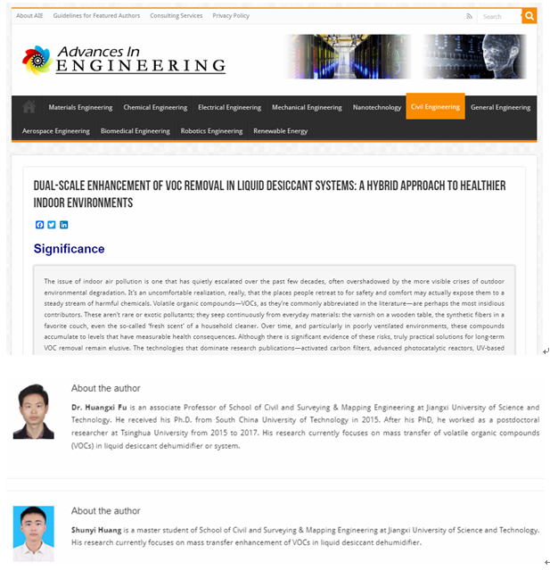 本网讯  近日,土木与测绘工程学院符黄喜副教授课题组发表在Applied Thermal Engineering期刊上的论文“A hybrid technology for enhancing VOC transfer in liquid desiccant dehumidifiers: Combining surfactant and internal cooling”被国际著名科技机构Advances in Engineering(AIE)遴选为关键科学文章,并以“Dual-Scale Enhancement of VOC Removal in Liquid Desiccant Systems: A Hybrid Approach to Healthier Indoor Environments”为题进行了专题报道。土木与测绘工程学院2022级硕士研究生黄顺意为论文第一作者,符黄喜为通讯作者。