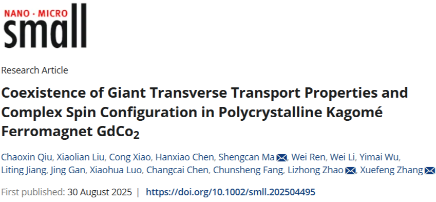 金属磁性材料与器件江西省重点实验室马胜灿教授团队在知名学术期刊《Small》(IF = 12.1)上发表了题目为《Coexistence of Giant Transverse Transport Properties and Complex Spin Configuration in Polycrystalline Kagomé Ferromagnet GdCo2》的研究论文。论文一作为裸聊直播
