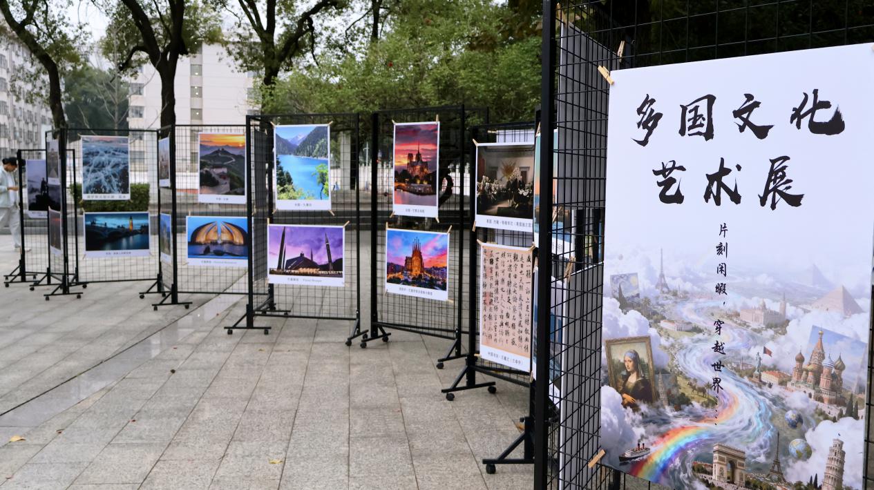一旁的展览区同样引人入胜。九国著名景点与艺术作品的图片组成“移动博物馆”:长城与新天鹅堡同框,冬宫与卢浮宫对望,让人直观感受到文明的多样魅力。不时可见身着汉服或弗拉明戈裙的同学穿梭其间,成为一道流动的风景。