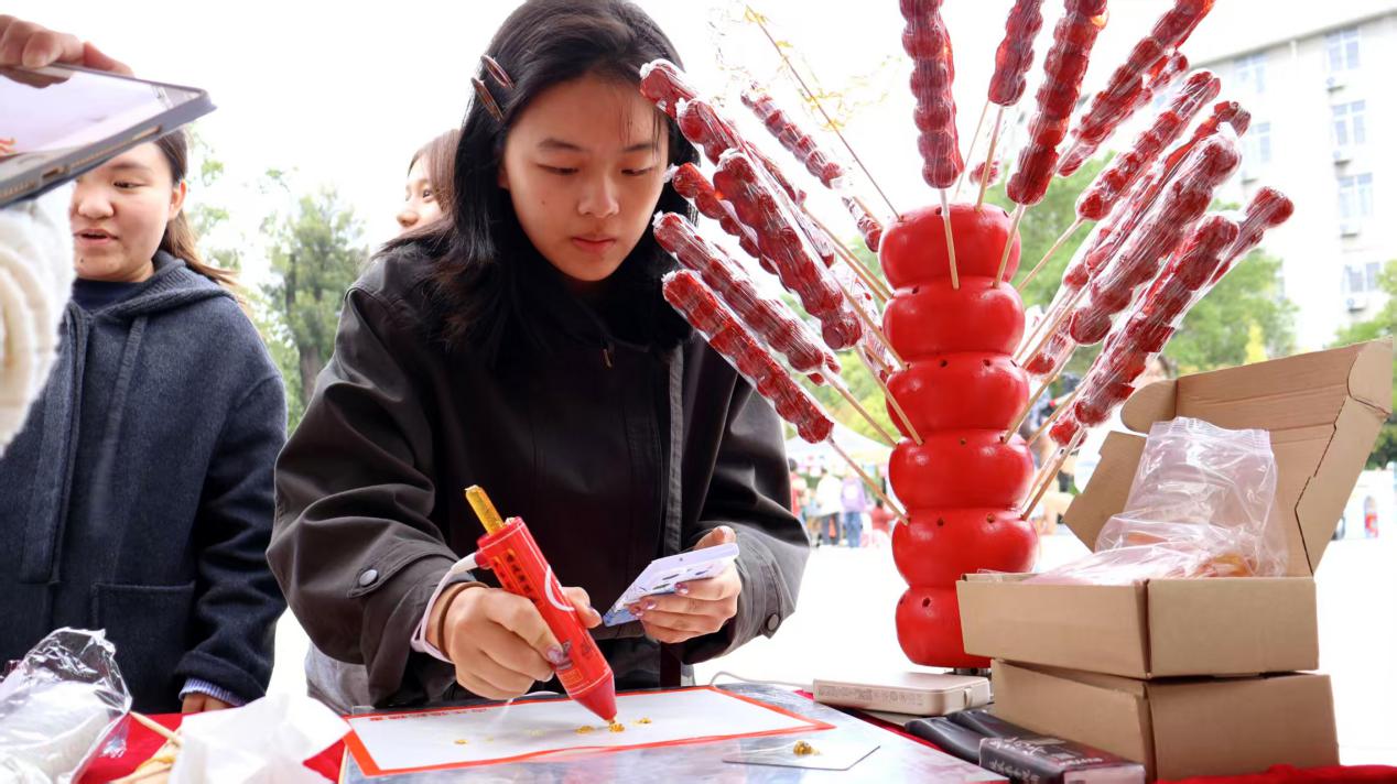 美食区始终是文化节的人气焦点,中式烟火气与异国风味在此交织,一场跨越山海的味道盛宴就此展开。糖葫芦的酸甜在齿间跳跃,糖画的脆香随热气弥漫,再轻呷一口清茶,甘醇顿时在舌尖温柔化开。同学们手持糖画笔,于腕底流转之间,勾勒出龙飞凤舞、花鸟呈祥的生动图案——这不仅是一场味觉的徜徉,更是一次视觉与手艺的双重盛宴。