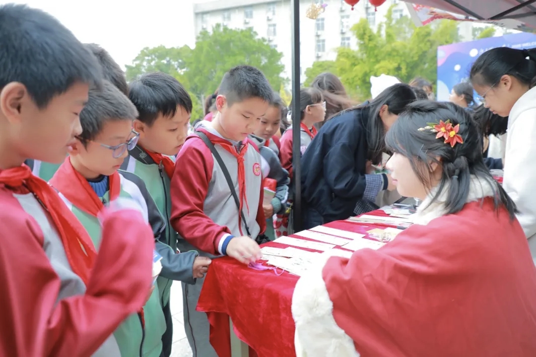 附属金岭学校的师生们。他们在文化广场合影留念后,便融入这片欢乐的海洋。舞台前,孩子们围坐观看表演,从活力四射的舞蹈到虎虎生风的双截棍表演,都让他们目不转睛。表演结束后,孩子们兴奋地涌入各个展位,在外语互动区跟读单词,在手工区体验异国技艺,清脆的跟读声和完成集章时纯真的笑脸,为这场跨文化之旅增添了一份独特的童趣与生机。