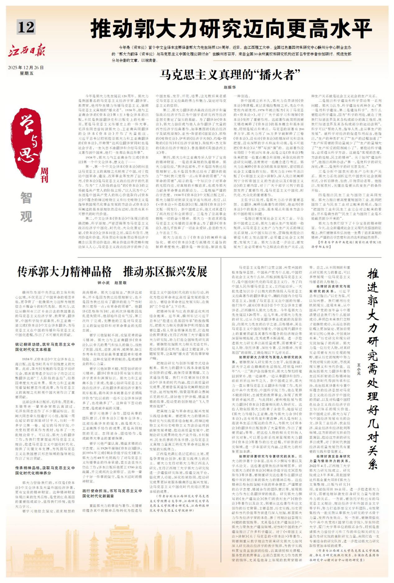 组织赵振华、钟小武和王小元三位学者撰写的学术论文于12月26日《江西日报》12版整版予以发表报道。三篇论文《马克思主义真理的“播火者”》《传承郭大力精神品格 推动苏区振兴发展》《推进郭大力研究需处理好几对关系》聚焦“推动郭大力研究迈向更高水平”主题,分别从郭大力翻译《资本论》与传播马克思主义,以郭大力精神品格服务苏区振兴发展和推动郭大力研究发展等三个方面共同阐述了如何推动郭大力研究迈向更高水平。